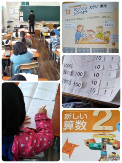 2年生の算数の授業の様子です。「1000より大きい数をしらべよう」の学習で、位の勉強をしました。カードを使い「3265」を表しました。