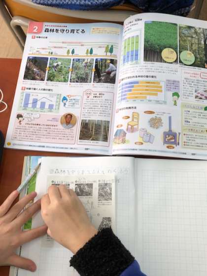 森林を守り育てる人々の工夫に、たくさんの児童が興味を抱いていました。