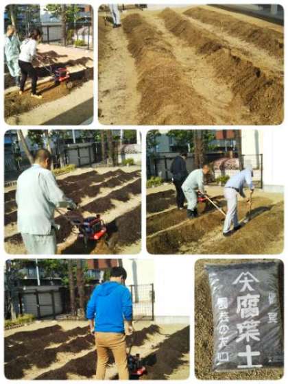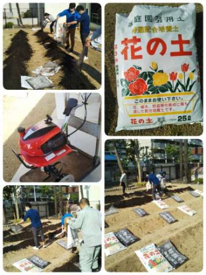 地域の方の協力で、毎年2年生がさつまいもを育てています。今日は、教職員で「さつまいも」の土づくりを行いました。腐葉土をまぜ、栄養分たっぷりの土を準備しました。