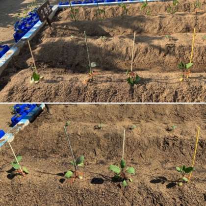 2年生のナスを見てください。(上) 元気がありませんね?これは水分が足りてないからなんです。この後、すぐに水やりをしました。すると、、、