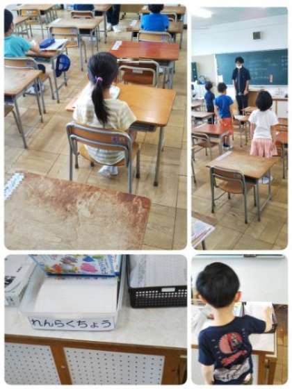 1年生の教室の様子です。一人で登校するのは、2回目です。今日も自分で教室まで行くことができました。朝の準備も自分で考え、しっかりとできました。連絡帳も自分で提出します。名札を自分でつける練習や自己紹介をみんなの前で行いました。自己紹介は、少し恥ずかしそうでしたが、大きな声で言うことができました。