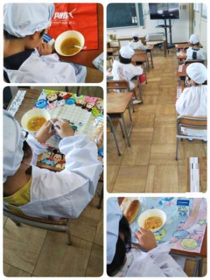 今日は、分散登校で全員では食べられませんが、1年生にとっては、初めての給食です。エプロンを着て、準備をしました。