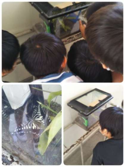 3年生の教室で飼育しているアゲハチョウの幼虫がさなぎとなり、成虫になりました。みんなでしっかり観察してから、自然の中へかえしてあげました。元気に飛び立ちました。