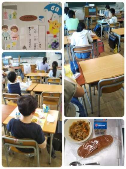 本日の給食は、「黒糖パン、マーボーはるさめ、牛乳」です。分散登校の給食の準備にも慣れ、すばやく準備できました。今日もおいしかったです。