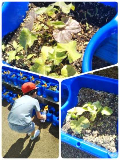 生活科で育てている「あさがお」に水やりをしています。どんどん大きく生長して、きれいな花を咲かせてほしいですね。