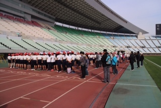 11月20日(木)晴天の下、6年生が長居陸上競技場・第二陸上競技場にスポーツ交歓会に行きました。大阪市内の6年生が集まり、世界レベルの選手が走るような競技場で実際に走ったり、サッカーやドッジボールをしたりする行事です。
