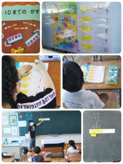 1年生の授業の様子です。算数「10までのかず」の学習を進めました。ブロックやドットを使い、「6、7、8、9、10」をしっかり練習しました。