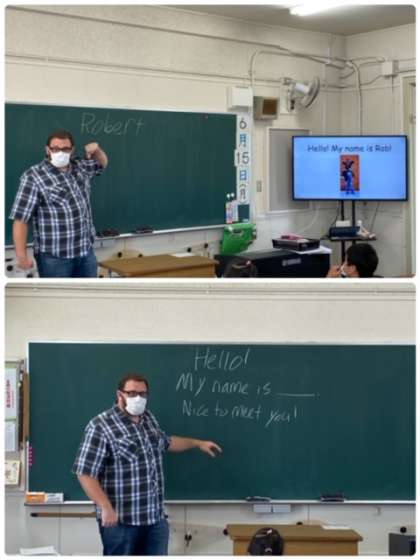 Rovert先生の自己紹介、クイズをした後、「My name is〜」の文型を使って、自己紹介の練習をしました。