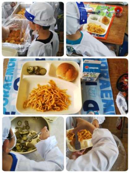 1年生の給食の時間の様子です。自分たちで準備をしました。給食当番もおかずやパン、牛乳を自分たちで用意します。緊張したけど、頑張りました。