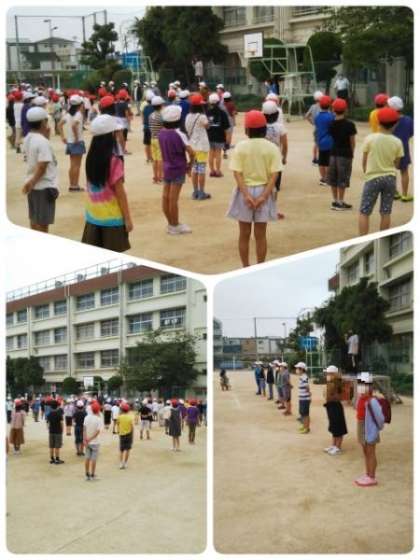 運動場で、間隔をあけて並び、児童集会を行いました。今日は、委員会活動の委員会紹介です。