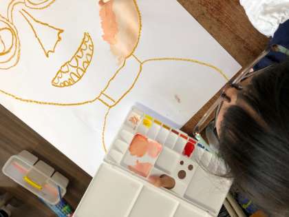 赤・青・黄の3色の絵の具を使って、自分の顔を描いて色をつけていました。