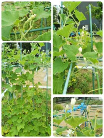 4年生の育てているひょうたんが大きく育っています。ひょうたんの花もきれいに咲いています。花が枯れた後には、小さな実もできています。これから大きな実になっていくことでしょう。