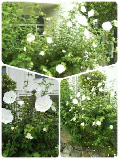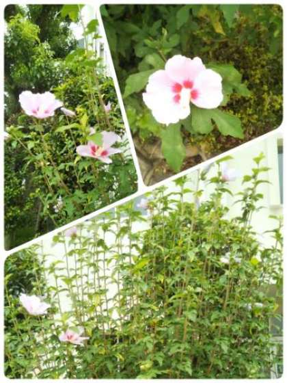 清水小学校の校庭には、様々な植物が育っています。正門から入って池の近くに、白い花と紫の花が咲いています。芙蓉の花です。とてもきれいに咲いています。