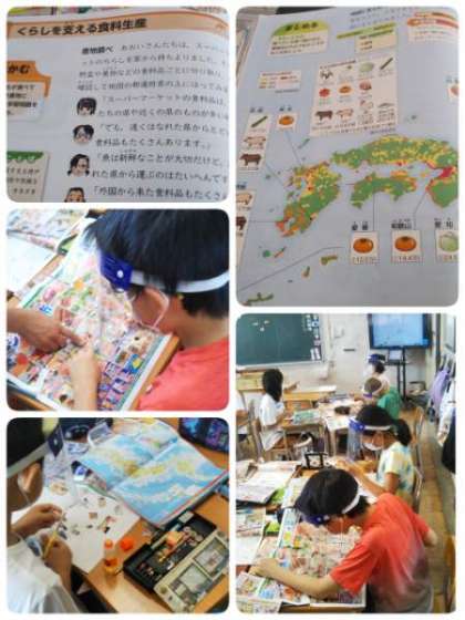 社会科の授業です。「くらしをささえる食料生産」の学習で産地調べをしました。チラシに書いてある産地を確認し、ノートにまとめました。日本各地や世界から様々なものが大阪まで来ていることがわかりました。