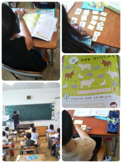 1年生の算数「かずを せいりしよう」の学習です。広場にいるどうぶつ(ひつじ、うさぎ、うま、あひる)の数をくらべます。「どのどうぶつが何匹いるか」わかりやすくなるように「動物かーど」を使って考えました。
