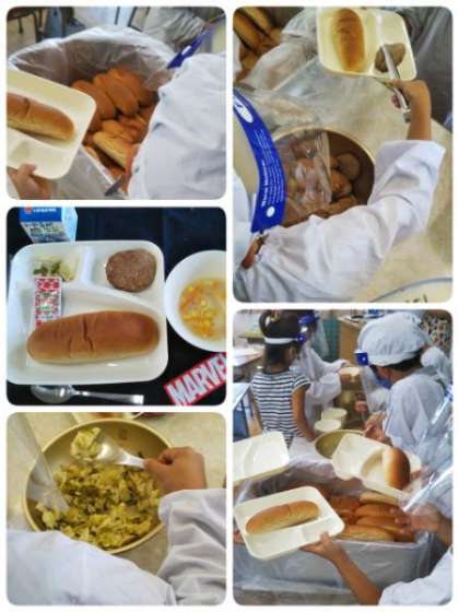 昨日から、給食が始まっています。2学期が始まってまだ2回目の給食ですが、1年生も準備するのがとても上手になりました。パンやおかず、牛乳と自分の役割の仕事をてきぱきと行っています。