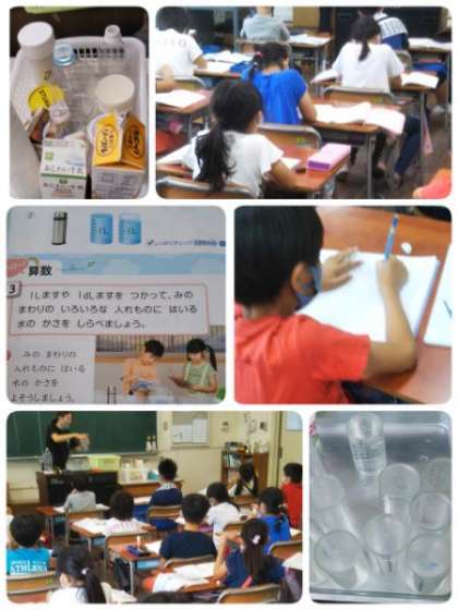 算数で「水のかさ」の学習をしました。身近にある牛乳パックやペットボトルなどの「水のかさ」を予想して、実際に自分たちで量りました。リットルやデシリットルの単位で表しました。