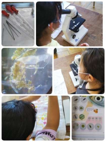 理科「食べ物を通した生物のつながり」の学習で、本校のビオトープ池の水を採集して調べました。顕微鏡でで見てみると、アオミドロやミジンコ、ツリガネムシなど、小さな微生物を見ることができました。メダカなどは、こうした微生物を食べて生きているんですね。