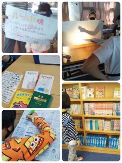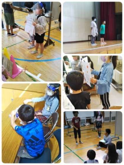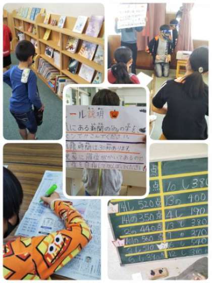 今年の出し物は、「コイン落とし」「記憶力ゲーム」「ジェスチャーゲーム」「イントロクイズ」「新聞やぶり」「豆つかみ」「シルエットクイズ」「『の』の字さがし」「本をさがそう」です。どのお店も、楽しく安全に楽しめるようにしっかりと工夫していました。新記録が出たお店もありました。