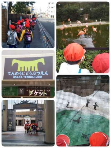 晴天に恵まれ、1年生は、天王寺動物園に遠足へ行きました。フラミンゴやトラ、カバ、サイなど、たくさんの動物を見てきました。ペンギンがすばやく泳ぐすがたやカバの大きな体を見て、とても驚いていました。