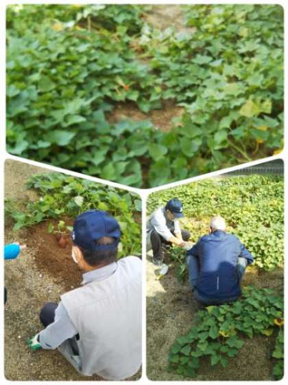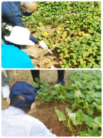 地域の方の協力で、2年生のさつまいもが大きく育っています。今日は、いもがどのくらい育っているか様子を見に来ていただきました。形もよく、もう少しすると「いもほり」ができそうです。とても楽しみですね。