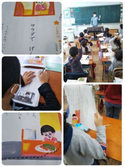1年生の国語の学習の様子です。りっちゃんがお母さんのために一生懸命サラダを作るお話です。