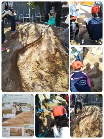 5年生の理科の授業です。「流れる水のはたらきと土地の変化の関係」について調べます。今日は南運動場の土山の上からじょうろで水を流し、地面の変化を調べました。