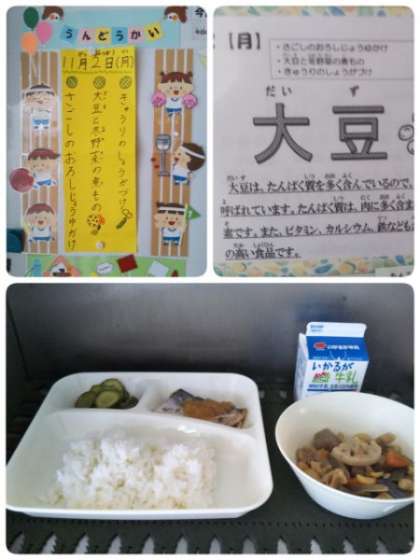 今日の献立は、「さごしのおろしじょうゆがけ」「大豆と冬野菜の煮物」「きゅうりのしょうがづけ」「ごはん」「牛乳」です。