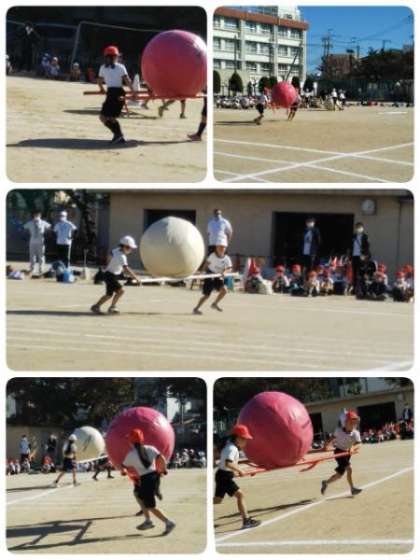 中学年となり、走る距離が長くなりました。力強い走りです。大玉運び、みんなで協力して頑張りました。