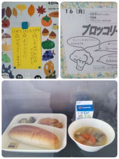 今日の献立は、「白身魚のフリッター」「洋風煮」「ブロッコリーのサラダ」「パン」「牛乳」です。