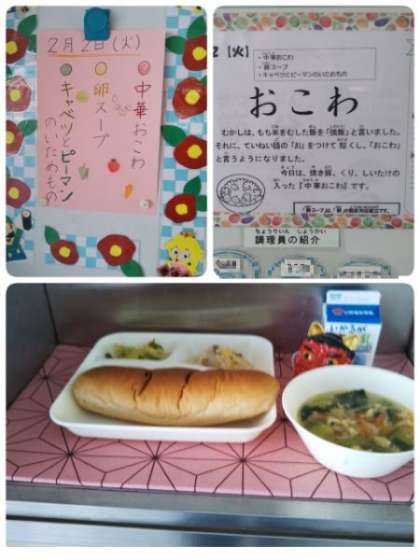 今日の献立は、「中華おこわ」「卵スープ」「キャベツとピーマンのいためもの」「パン」「牛乳」です。