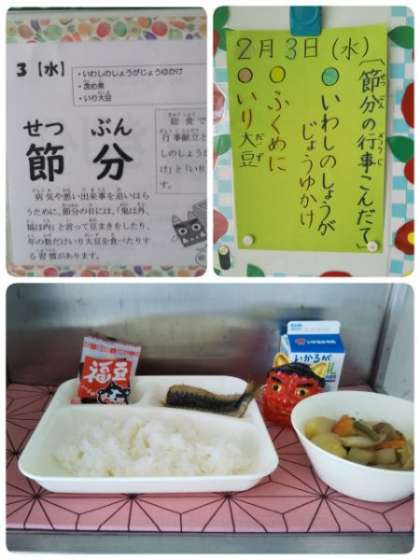 今日は、節分の行事献立です。節分の日には、病気や悪い出来事を追いはらうために「鬼は外、福はうち」と言って、豆まきをしたり、年の数だけいり大豆をたべたりする習慣があります。
