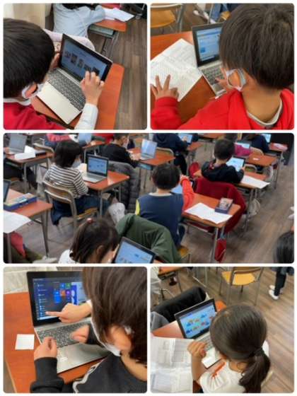 2年生では、タブレットパソコンにローマ字表を見ながら検索をしたり、絵を描いたりとタブレットの使い方に慣れてきています。