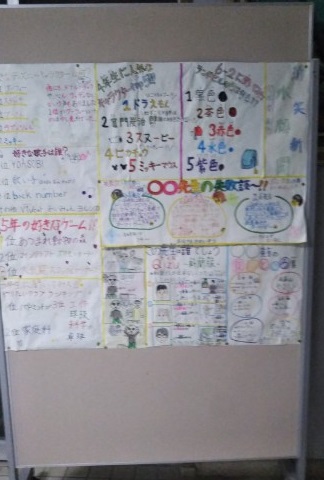 「4年生に人気のキャラクター」ランキングや「〇〇先生の失敗談」「この先生は誰でしょうクイズ」等、おもしろい記事がたくさんあります。玄関に掲示しています。