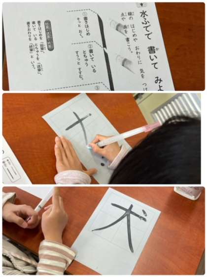 子どもたちは、水を入れた筆ペンで「止め」「はね」「はらい」に気を付けながら集中して書いていました。硬筆とは違う感覚に戸惑いながらも、筆独特の感覚を楽しんでいました。