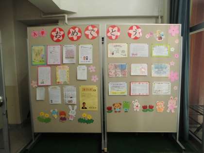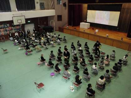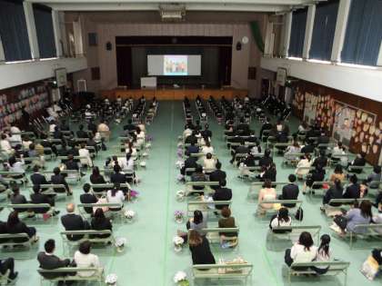 晴天のもと、今年度の入学式を挙行いたしました。1年生は、姿勢よくしっかりと式に臨んでいました。2年生からのお祝いのメッセージビデオの後、お祝いのメダルを一人ひとりに渡しました。