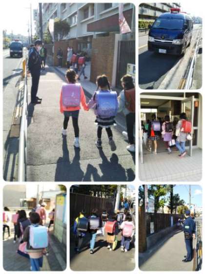 朝の登校の様子です。みんな大きな声で「おはようございます」と元気にあいさつをしています。旭警察の方も子どもたちの安全を見守ってくださっています。ありがとうございます。