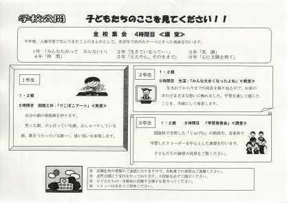4時間目は講堂で全校集会、5時間目は授業参観です。
