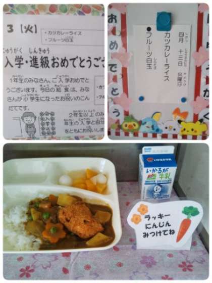 今日の献立は、「カツカレーライス」「フルーツ白玉」「牛乳」です。今日の献立は、1年生のみなさんが小学生になったお祝いの献立です。2年生以上のみなさんも、1年生の入学と自分たちの進級をともにお祝いしましょう。