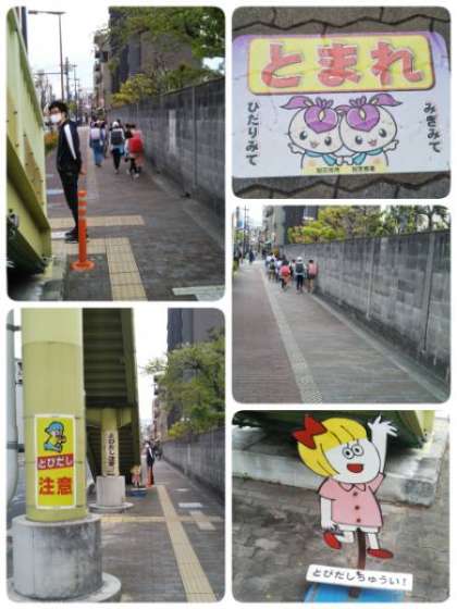朝の登校の様子です。歩道橋を渡ってくる子どもたちは、歩道橋を降りた時に「いったん止まって、右左を見て」安全を確認してから動くようにしましょう。朝の登校時間には、自転車がたくさん走っています。気をつけて登校してください。