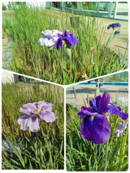 ビオトープで育てている菖蒲の花が、きれいに咲きました。校内美化委員会が毎年株分けを行い、お世話をしています。