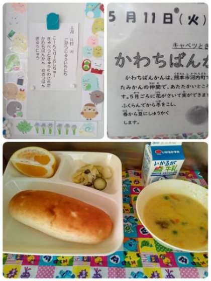 今日の献立は、「コーンクリームシチュー」「キャベツときゅうりのサラダ」「かわちばんかん」「おさつパン」「牛乳」です。「かわちばんかん」は、熊本県河内町(かわちちょう)で発見されたみかんの仲間で、あたたかいところで育ちます。5月ごろに花が咲いて実ができますが、実がふくらんでから冬をこし、春から夏に収穫します。