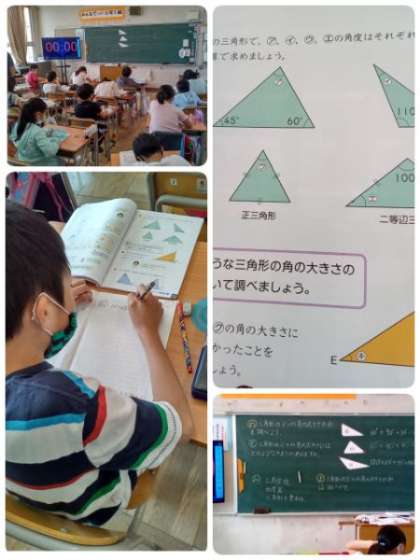 5年生の算数です。「三角形の3つの角の大きさの和を調べよう」をめあてに考えました。三角定規や分度器も活用し、3つの角の大きさが180°であることがわかりました。