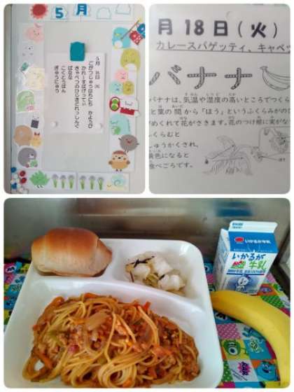 今日の献立は、「カレースパゲティ」「キャベツとひじきドレッシング」「バナナ」「黒糖パン」「牛乳」です。