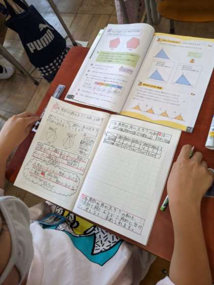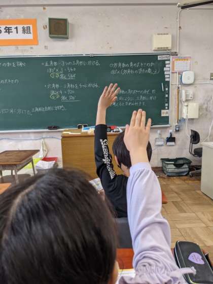 五角形や六角形を三角形に分けて、角の大きさの和を求めました。