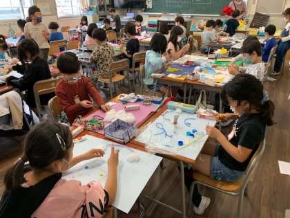 学校にある材料や家から持ってきた材料から、いろいろなものを想像して画用紙に貼っています。