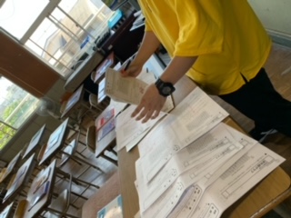 教室の見回りをしていると、空き教室では先生がみんなの丸付けをしていました。