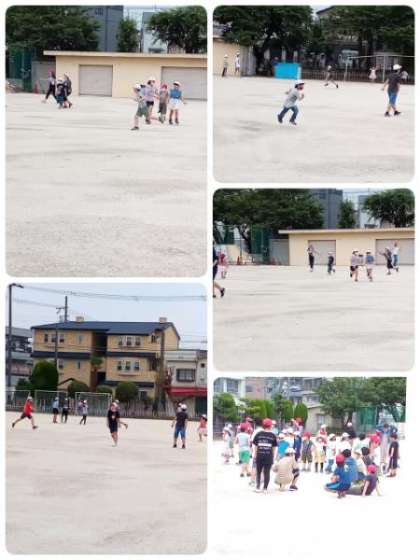 6年生が1年生と休み時間に交流をしています。みんなでおにごっこをして、元気いっぱい走り回っています。走るときには、スピードを落とす優しい先輩です。