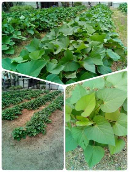 2年生が育てているさつまいもの葉が大きくなっています。太陽の光と水をたっぷりと吸って、青々と茂っています。秋が楽しみです。
