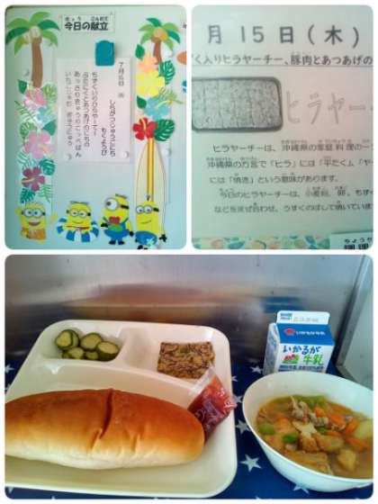 今日の献立は、「もずく入りヒラヤーチー」「豚肉とあつあげの煮物」「あっさりきゅうり」「コッペパン」「いちごジャム」「牛乳」です。